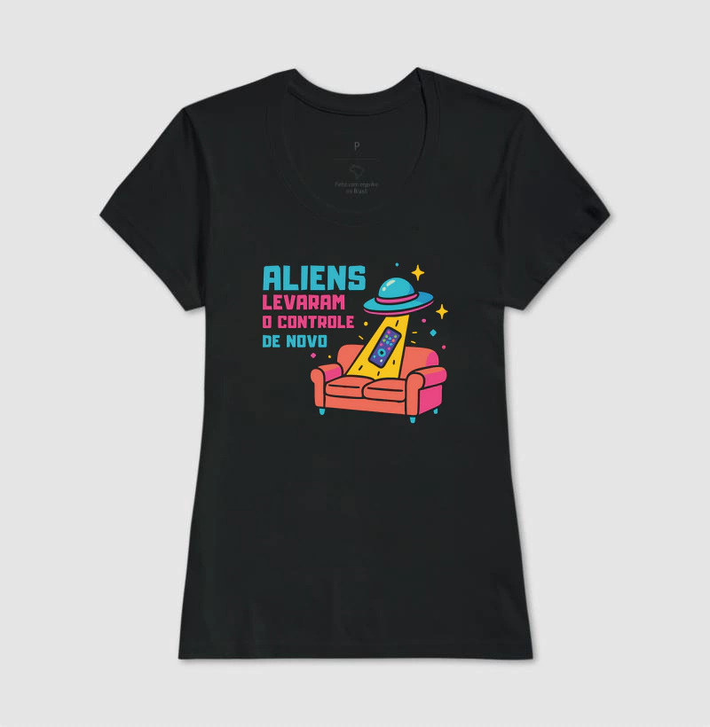 A camiseta "Aliens levaram o controle de novo" traz uma arte colorida e estilizada qperfeita para quem já perdeu a paciência procurando o controle remoto (ou acredita que os ETs têm algo a ver com isso ??).